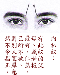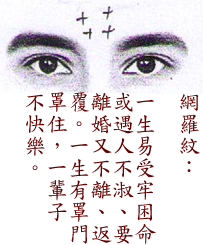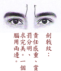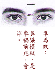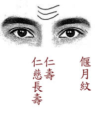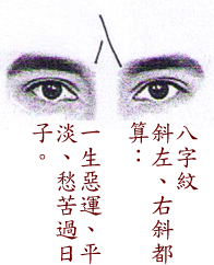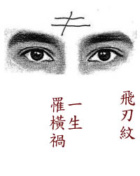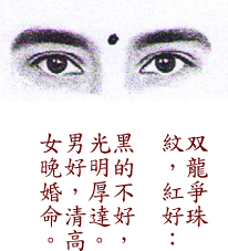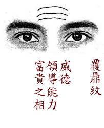 家庭出生,小時較辛酸,(或屬貧相)或不受長輩疼愛。 印堂:兩眉中間有條直紋與妻的緣份較薄,兩眉中八字紋較時運不濟,要到四十