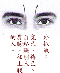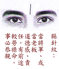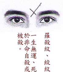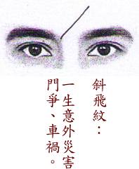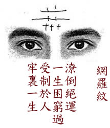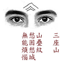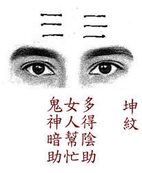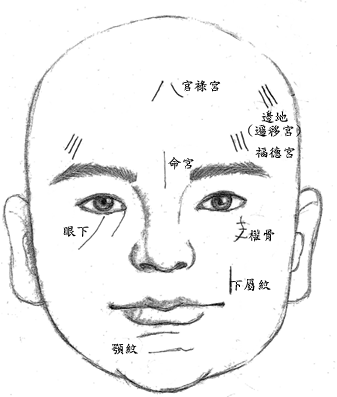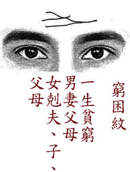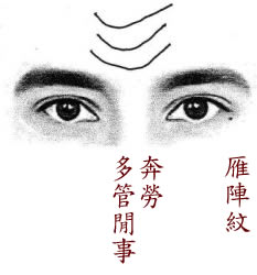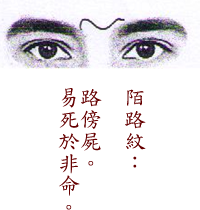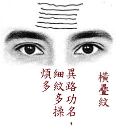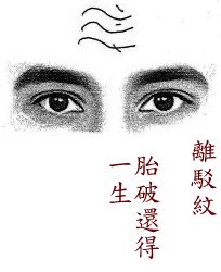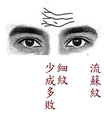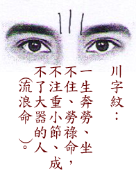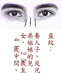 家庭出生,小時較辛酸,(或屬貧相)或不受長輩疼愛。 印堂:兩眉中間有條直紋與妻的緣份較薄,兩眉中八字紋較時運不濟,要到四十